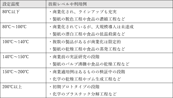 現在、産業用ヒートポンプは、様々な性能の製品が提供されています。2024年時点のヒートポンプの技術レベルや利用用途は以下のとおりです。