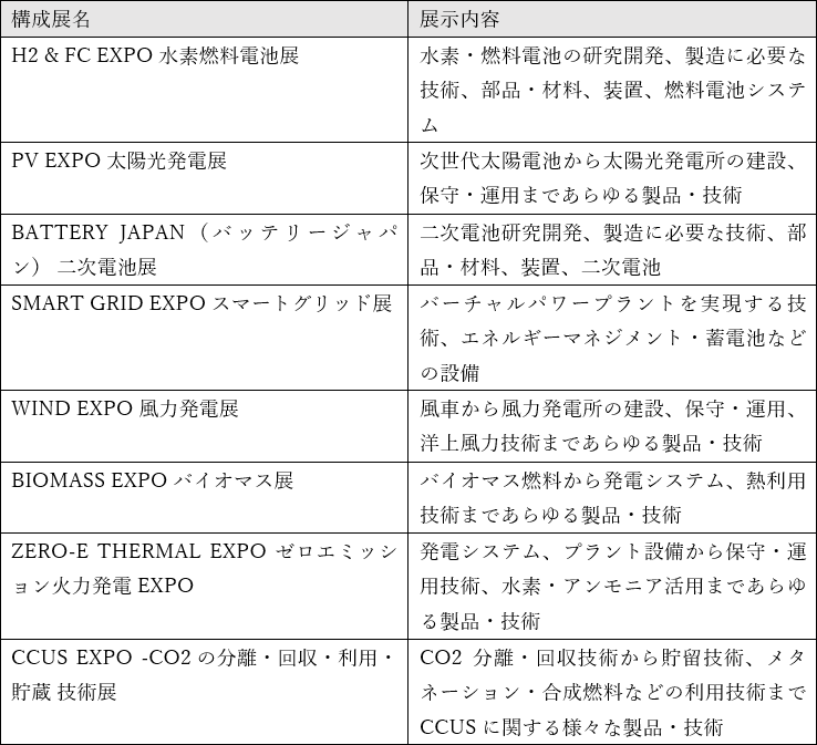 ※「H2 & FC EXPO 水素燃料電池展」「PV EXPO 太陽光発電展」「BATTERY JAPAN 二次電池展」「SMART GRID EXPOスマートグリッド展」「WIND EXPO 風力発電展」「BIOMASS EXPO バイオマス展」「ZERO-E THERMAL EXPO ゼロエミッション火力発電EXPO」「CCUS EXPO -CO2の分離・回収・利用・貯蔵 技術展」は、「SMART ENERGY WEEK -スマートエネルギーWeek-」の構成展です。