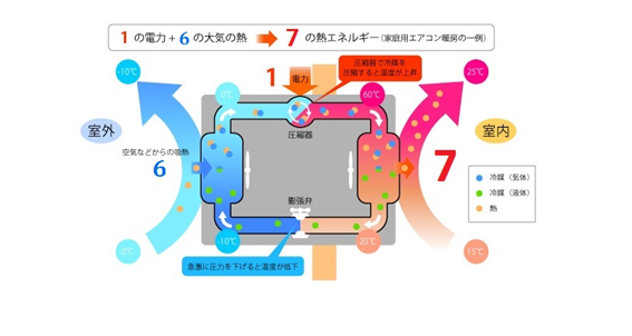 ヒートポンプは、例えば先述のヒートポンプの原理図によると、大気中から「6」の熱を取り込み、「1」の電力で合計「7」の熱を生み出すことが可能です。この場合、COP(成績係数)は「7」となり、高いエネルギー効率で熱を利用できます。