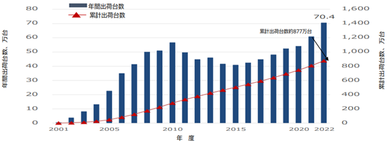 年間出荷台数が低迷した時期もあったものの、2022年は70.4万台を記録しました。2022年度末までの累計出荷台数は約877万台であり、資源エネルギー庁が発表したエネルギー需給の見通しでは、2030年度末までに1,590万台の目標が設定されています※1。