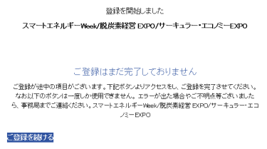 「ご登録が途中の項目がございます。完了をお願いいたします。」というタイトルのメールが届いているかご確認いただき、”まだ完了していません”をクリックし途中からご入力ください