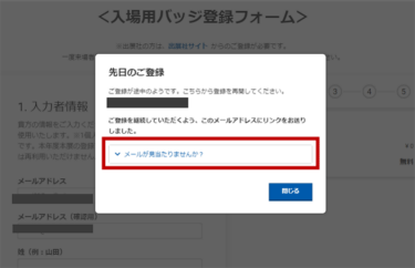 ご登録後に届く「来場登録が完了しました / Thank you for your registration.」というタイトルのメールを保管いただき 、メール本文にある”バッジをダウンロードする”をダウンロード可能日以降に押すとバッジが表示されるようになります。