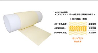 説明:X-SEPA™は、耐熱性の高いポリイミドに、三次元規則配列に均一な空孔を形成した膜を多層に重ね合わせた構造を有しており、この独自の構造により、各層の特性を細かく制御しながら、用途や求められる電池性能に応じて全体を最適化することが可能です。