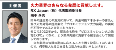 昨今の脱炭素化の潮流において、再生可能エネルギーの普及と並び火力発電の脱炭素化「ゼロエミッション火力発電」の実現が不可欠であると考えております。そこで2022年から、展示会名称を「ゼロエミッション火力発電EXPO」に改め、より業界発展に貢献する展示会として開催しております。火力業界の皆様の期待に応えることを固く決意しておりますので、何卒絶大なるご支援とご協力をお願い申し上げます。