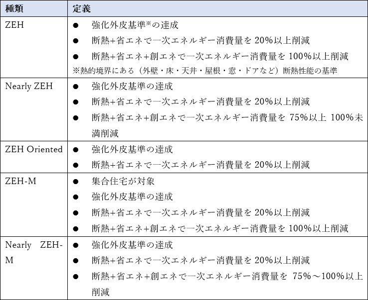 ZEHは、エネルギー消費量の削減割合や対象などによりいくつかの種類に分かれます。ZEHの主な種類と定義は次のとおりです。