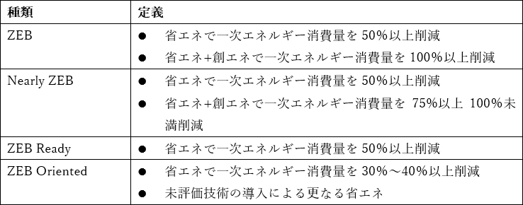 両者の主な違いは対象物です。ZEHは住宅を対象とするのに対し、ZEBは住宅以外の建物(ビルや工場、学校など)を対象としています。ZEBの種類とその定義は次のとおりです。