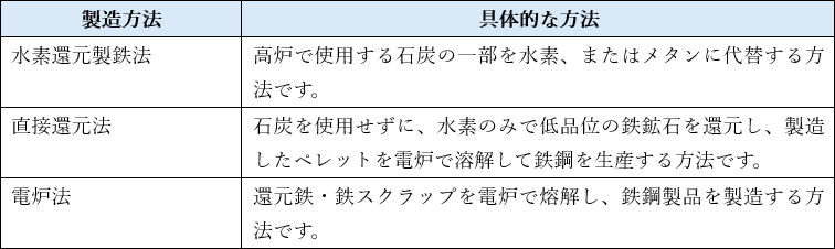 グリーンスチールの製造方法には、「水素還元製鉄法」「直接還元法」「電炉法」があり、それぞれの特徴は以下のとおりです。