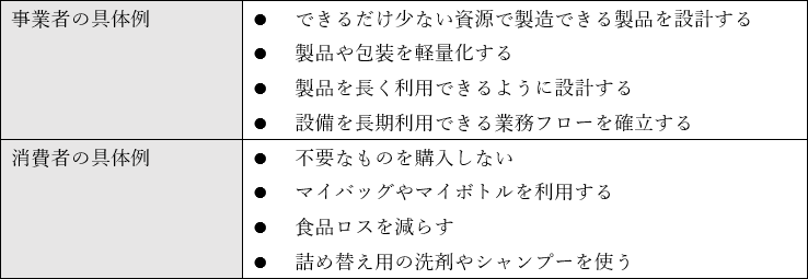 リデュースでは、製品の製造時に投入する天然資源の消費を少なくする、消費者はワンウエー製品を購入しない、使わないなどの取り組みを通じて、廃棄物の発生を削減します。廃棄物の低減に直接つながるため、3Rのなかでも最も優先度の高い活動です。