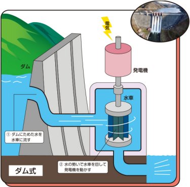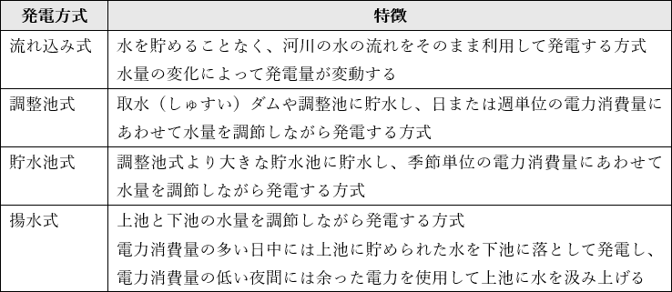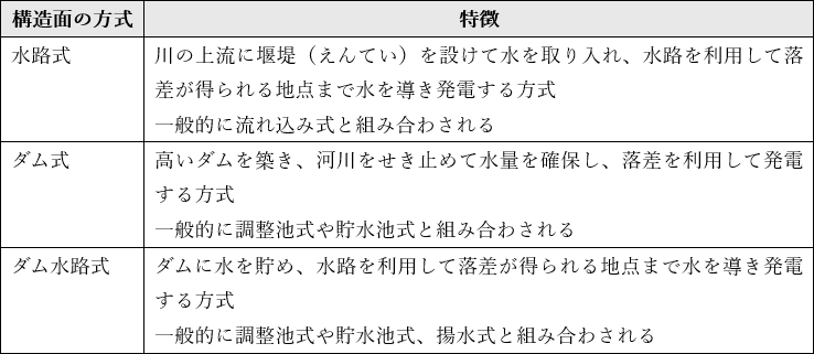 さらに、構造面(落差を得る構造)では、以下の3つに分類されます。