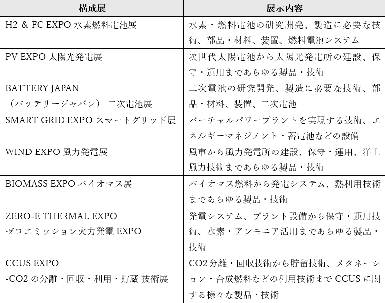 ※「H2 & FC EXPO 水素燃料電池展」「PV EXPO 太陽光発電展」「BATTERY JAPAN 二次電池展」「SMART GRID EXPOスマートグリッド展」「WIND EXPO 風力発電展」「BIOMASS EXPO バイオマス展」「ZERO-E THERMAL EXPO ゼロエミッション火力発電EXPO」「CCUS EXPO -CO2の分離・回収・利用・貯蔵 技術展」は、「SMART ENERGY WEEK -スマートエネルギーWeek-」の構成展です。