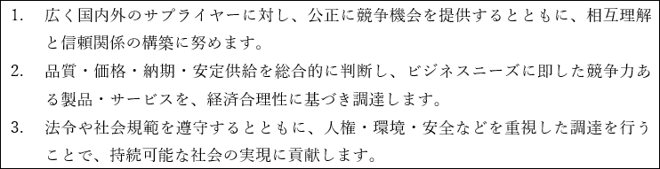 この方針の基、ステークホルダーとともに人権の尊重や環境保全に配慮した調達活動を進めており、その進捗状況を開示することで透明性の高い取り組みを実現しています※。