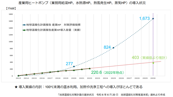 一方、産業用ヒートポンプ(業務用給湯ヒートポンプ、水熱源ヒートポンプ、熱風発生ヒートポンプ、蒸気ヒートポンプ)の導入状況は、以下のとおりです。