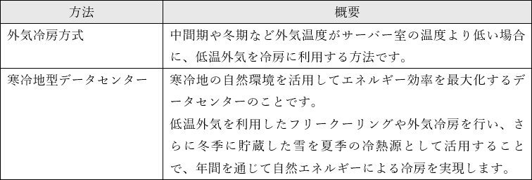 しかし、グリーンデータセンターでは低温の外気を利用し、エネルギー削減を実現している事例があります。例えば、外気冷房方式や寒冷地型データセンターが挙げられます。