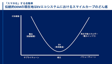 EVビジネスの収益性はサプライチェーンの川上、バリューチェーンの川下の両側が高く、真ん中が低いスマイルカーブ(図表参照)になっているというわけだ。