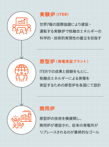 それが核融合から私たちが「無限のエネルギー」を享受できるまでのおおまかな流れです。