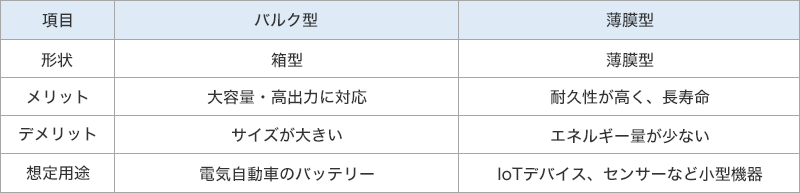 全固体電池は、製造方法によって大きく「バルク型」と「薄膜型」に分類され、それぞれ蓄えられるエネルギーの量が異なります。