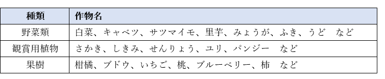 ソーラーシェアリングでは、豊富な種類の作物を栽培できます。
