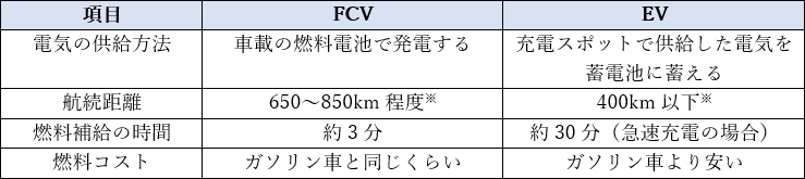 その他、FCVとEVでは、航続距離や燃料補給の時間、燃料コストに違いがあります。