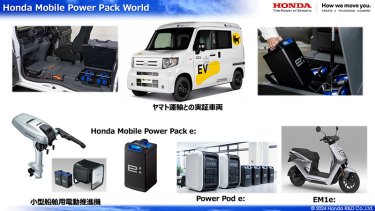 可搬式着脱バッテリー「Hondaモバイルパワーパックe」。商用車や二輪車、ポータブル電源など様々な用途に対応している