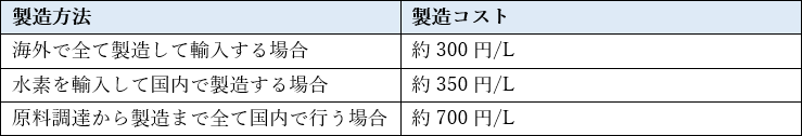 国内で原料調達から製造まで行った場合の製造コストは約700円/Lと想定されており、化石燃料と比較すると高い製造コストです。実用化のためには、今後のさらなる低価格化に向けた民間企業や研究機関のコスト削減の取り組みが求められます。