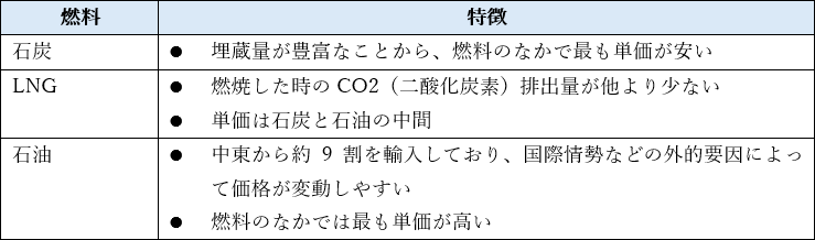 火力発電で使われる主な燃料には、「石炭」「LNG(液化天然ガス)」「石油」があります。それぞれの特徴は以下のとおりです。