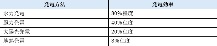 再生エネルギー由来の発電方法ごとの発電効率は、以下のとおりです※。