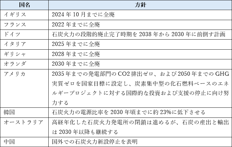 石炭火力に関する主要各国の方針は、以下のとおりです。