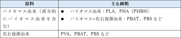 生分解性プラスチックの種類には、化石資源を原料とするものと、バイオマスを原料とするもの(バイオプラスチック)がある他に、バイオマスプラスチックと同様にバイオマス+化石資源由来のものもあります。