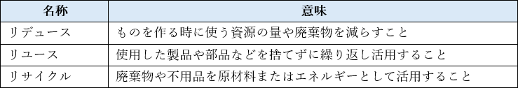 3Rとは、Reduce(リデュース)、Reuse(リユース)、Recycle(リサイクル)の頭文字を取った略称です。