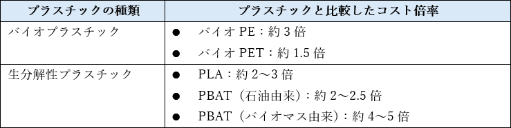 バイオプラスチックは環境に優しい反面、コストに関しては通常のプラスチックより高いといわれています。以下は、バイオプラスチックとプラスチックのコストを比較した一例です※。