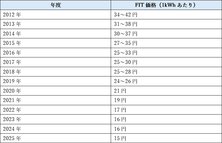 FIT制度がスタートした2012年から2025年までのFIT価格には11~27円/kWhの差があり、同様に発電量が10kW以上の太陽光発電もFIT価格は減少しています。