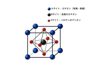 ペロブスカイト太陽電池とは、「ペロブスカイト」という鉱物の結晶構造を利用した太陽電池。図はペロブスカイト結晶構造(ABX3)