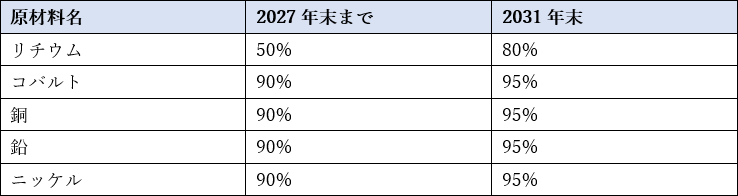 バッテリーの主要原材料で、2031年末までに80%以上の再資源化率を目標とする高い数値です。