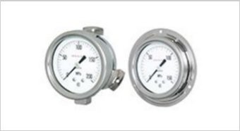 説明:高圧水素専用の圧力計として製品化しました。安全対策として前面ガラスはセーフティガラス、目盛の裏側に強固な壁を設け、ブルドン管が万一破損した場合はケース背面の安全フタが外れるソリッドフロント構造です。
