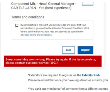 If the error persists, Show Management can complete the registration on your behalf. Please contact Show Management and provide a screenshot of the error.
