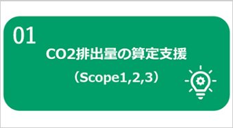 説明:CO2排出量の算定から削減施策の立案・実行までワンストップで提供しているサービスです。企業とサプライチェーン全体のCO2排出量(Scope1~3)を算定・可視化が可能です。誰でも簡単に利用を開始できるというコンセプトをもとに、操作マニュアルや動画の学習コンテンツ、フォローアップ面談、チャットボットのお問合せ対応など、算定業務を行ったことがないお客さまにも、お気軽にご利用いただける仕様となっております。 また、業種や施設のタイプ、貴社のCO2排出量推移の状況に応じて削減策を自動で表示するレコメンド機能を提供しておりますので、具体的な脱炭素施策を検討する際のツールとしてもご活用いただけます。