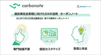説明:カーボンノートは、地方自治体向けシステムを数多く手掛けるオーイーシーとビジネスパーソンの教育事業を行うジャパンラーニングが脱炭素経営に取組む企業向けに共同開発したクラウドサービスです。 「自社のCO2排出量を把握したい」「CO2削減をどこから始めればよいかわからない」「取引先からCO2排出量の削減を求められている」といったご要望にお応えします。