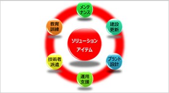 説明:当社はプラント設備の建設・据付・メンテナンスのみならず、設計力を活かしたEPC、設備保全業務の支援、高い技能を持つ専門技術者の派遣、メンテナンス知識・技術力向上の為の研修など、多彩なソリューションアイテムでお客様ニーズにお応えします。
